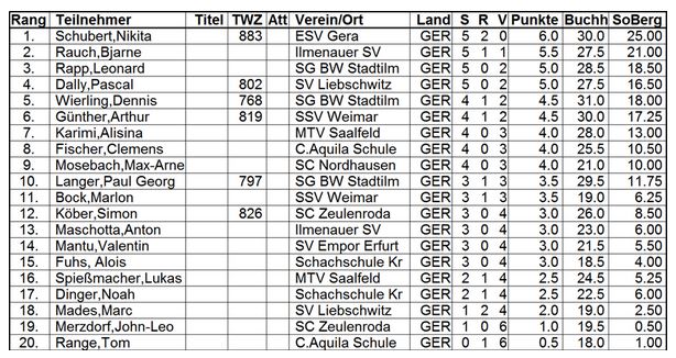 Mit 6 Punkten aus 7 Partien wurde Nikita Schubert in Dittrichshütte Thüringer Meister. Nach 3 Siegen und einem Remis am ersten Tag startete er mit zwei weiteren Siegen in den entscheidenden zweiten Tag. Den Meistertitel sicherte er sich mit einem Remis in der letzten Partie.
