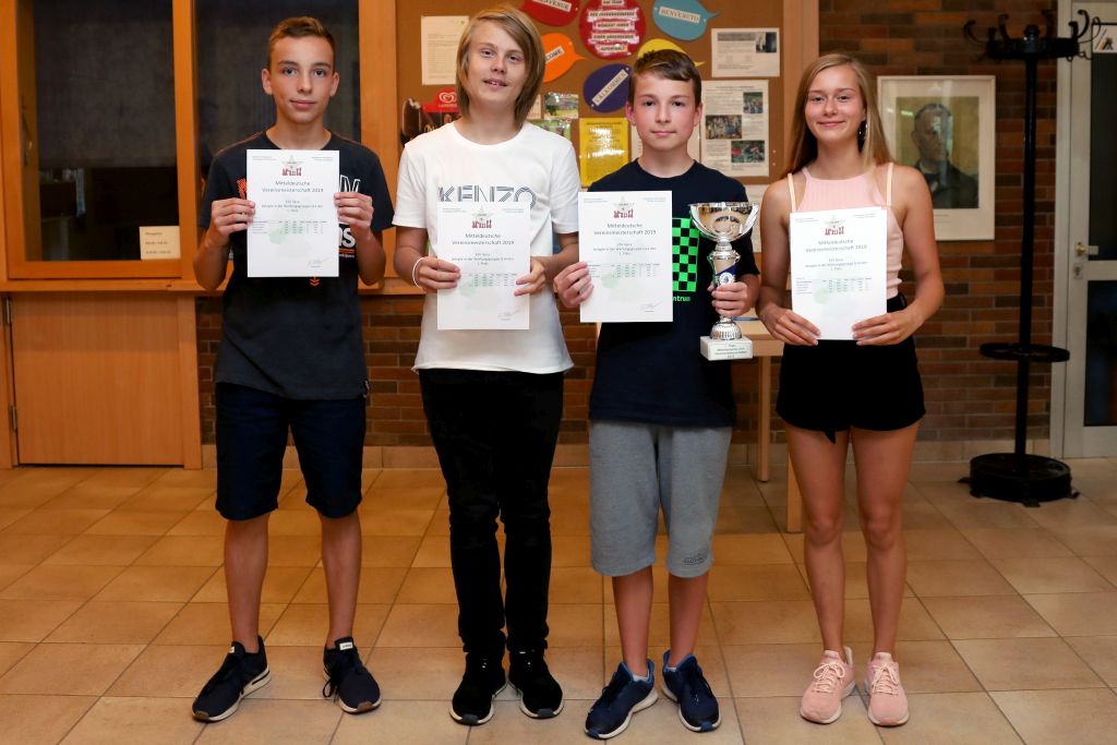 Das U14-Team löste die Aufgabe mit höchster Konzentration und wurde sehr überzeugend Mitteldeutscher Vereinsmeister. Damit verteidigten sie den Titel aus dem Vorjahr. Mit 10 : 0 Punkten und 19 : 1 Brettpunkten fiel der Sieg deutlich höher aus, als vorauszusehen war. Die Mannschaften SK Frankenthal (RLP), SF Neuberg (HES) und Merchweiler (SAA) wurden 4 : 0 besiegt. Gegen SC Landeskrone (RLP) und SC Koblenz (RLP) wurde jeweils 3,5 : 0,5 gewonnen. Die Spieler, Nikita Schubert (5,0 Punkte), Magnus Müller (4,5), Marek Frank (4,5) und Anna Sophie Gerber (5,0) wurden ihrer Favoritenrolle gerecht. Von insgesamt 20 gespielten Partien konnte 18 gewonnen und 2 remisiert werden - ein tolles Ergebnis - Gratulation.