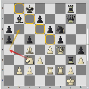 Dieter erreichte am Spitzenbrett nach dem 34. Zug diese deutlich bessere Stellung. Den Bauern auf a5 mit Schachgebot zu schlagen, war einfach zu verlockend, da er hoffte, auch noch im folgenden Zug das Zentrum öffnen zu können. Gesagt – getan, doch genau diese Reihenfolge wurde zum Bumerang: